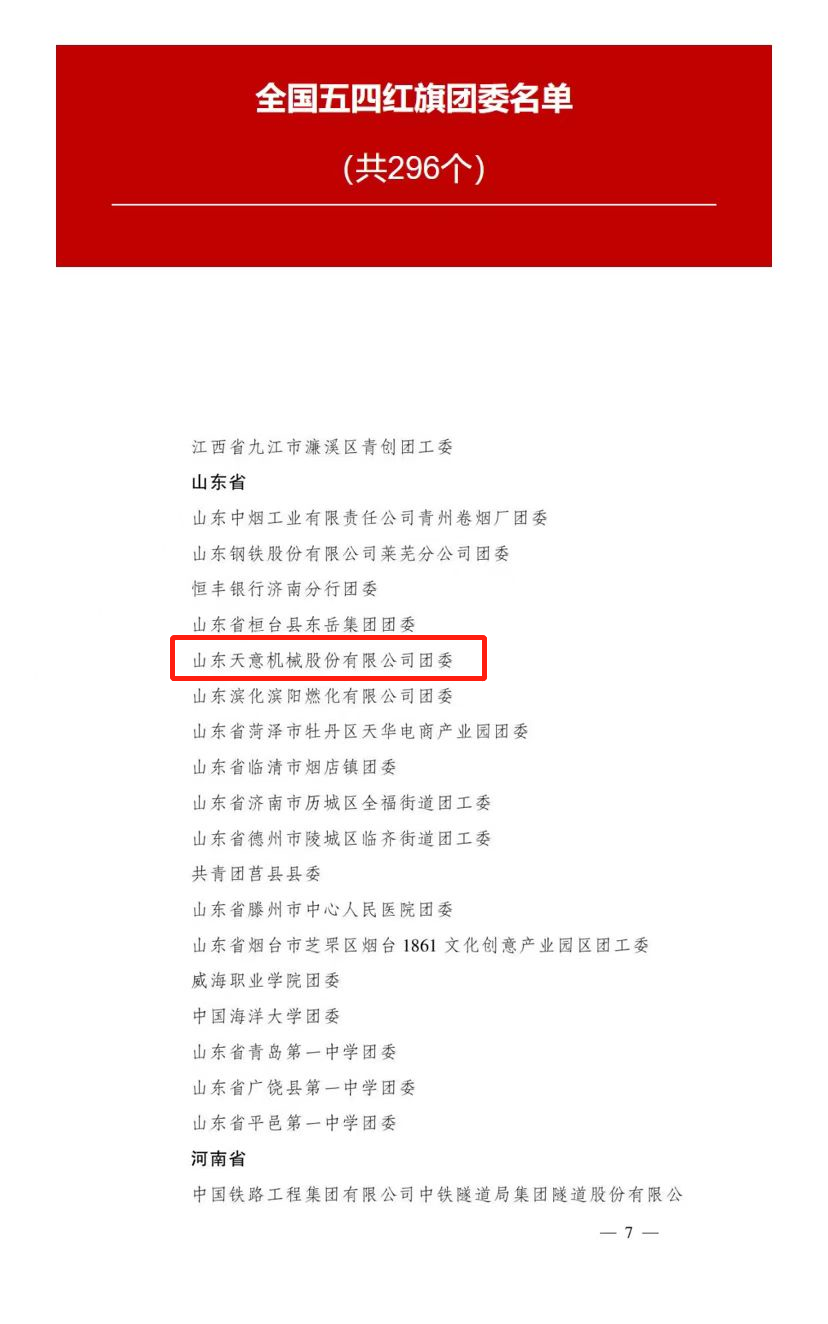 2023年是全面貫徹落實黨的二十大精神的開局之年。近日,共青團中央作出表彰決定,授予296個團組織全國五四紅旗團委稱號;授予389個團組織全國五四紅旗團支部稱號;授予481名同志(含追授1名)全國優(yōu)秀共青團員稱號;授予342名同志全國優(yōu)秀共青團干部稱號。山東天意機械股份有限公司團委榮獲全國五四紅旗團委榮譽稱號。
