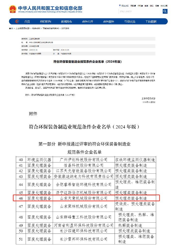 近日,工信部公布了2024年環(huán)保裝備制造業(yè)規(guī)范條件企業(yè)名單,天意機(jī)械成功入選工信部2024年度環(huán)保裝備制造業(yè)(固廢處理裝備)規(guī)范條件企業(yè)。