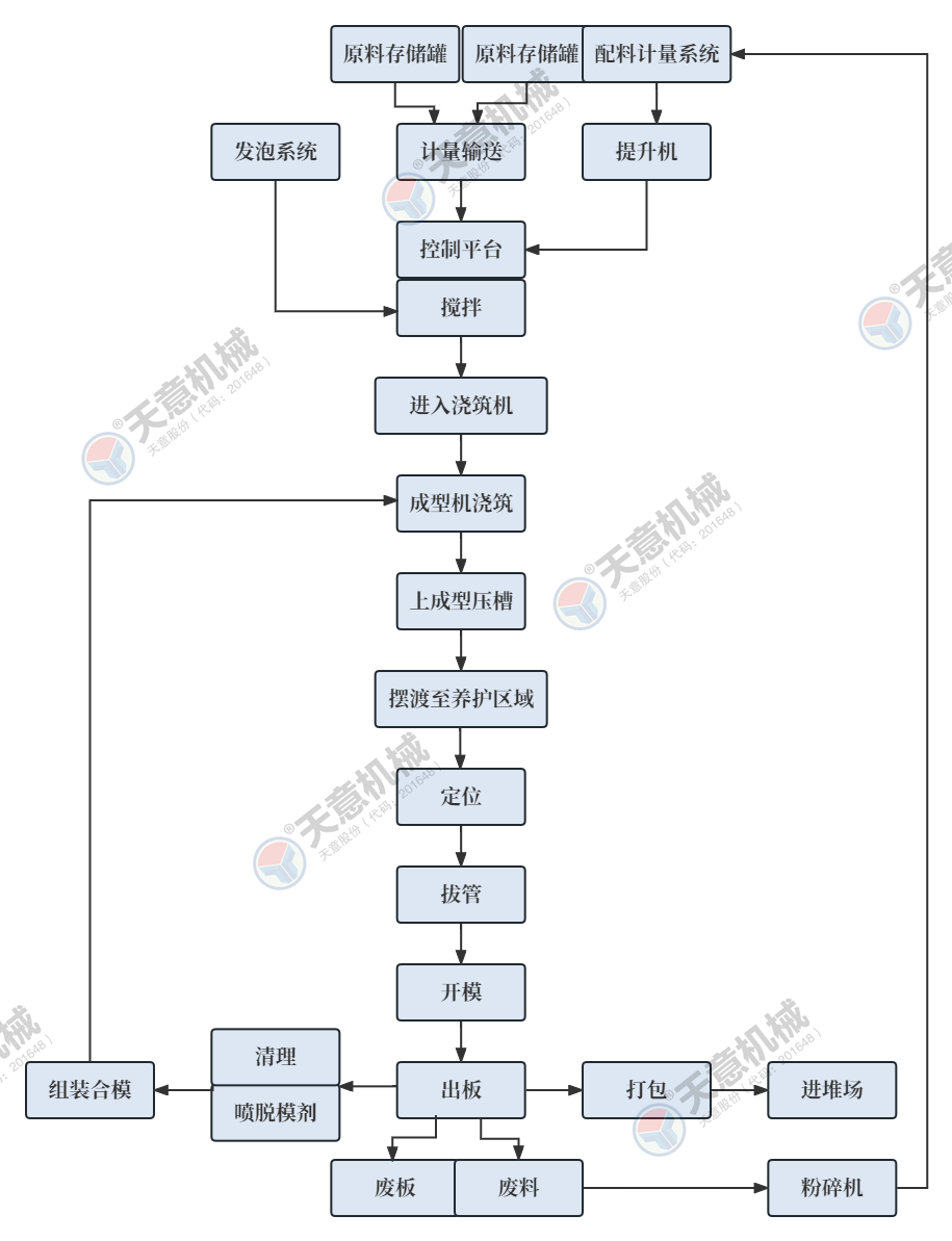 TY12型墻板生產(chǎn)線包括:墻板成型機、整體穿抽管系統(tǒng)、發(fā)泡系統(tǒng)、水箱、電子計量儲料倉、螺旋上料輸送機、儲料罐、螺旋輸送機、EPS熟化料倉、硫化干燥床、EPS預(yù)發(fā)機、數(shù)控配電室、發(fā)泡攪拌機、整體出板系統(tǒng)、叉車、成品堆放區(qū)、擺渡車。
